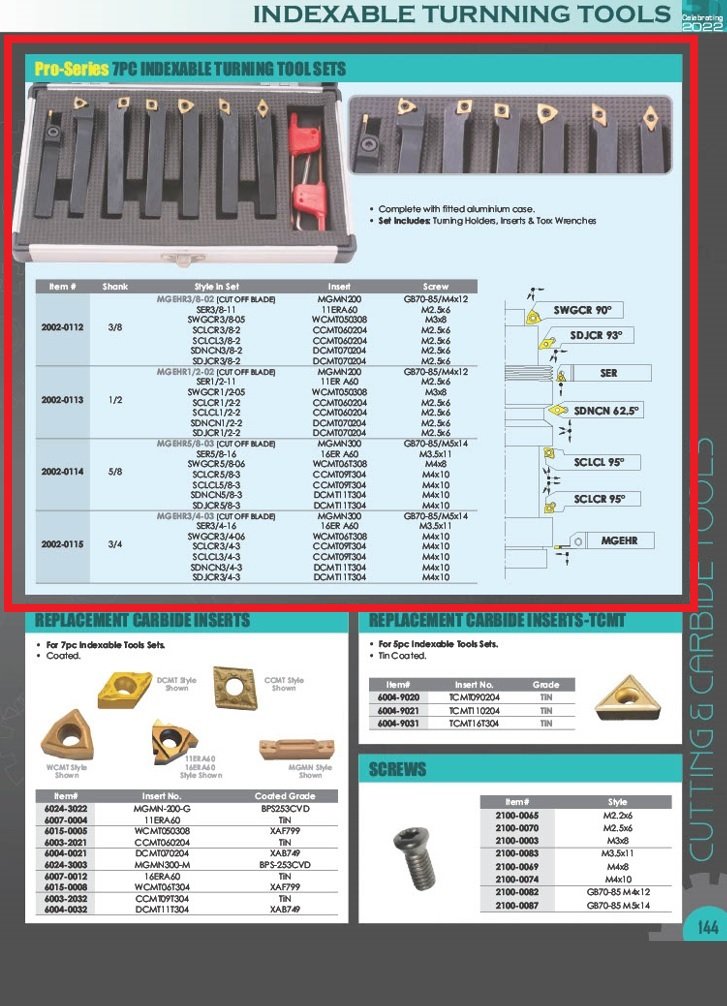 PRO-SERIES 7 PIECE 1/2 INDEXABLE CUT OFF & TURNING TOOL SET (2002-0113). Key features: Pro-Series 7 Piece 1/2 Indexable Cut Off & Turning Tool Set; Set includes turning holders, inserts & torx wrenches..