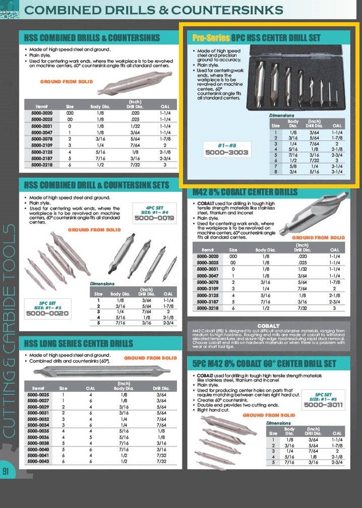 - Pro-Series 8 Piece High Speed Steel No.1-No.8 Center Drill Set